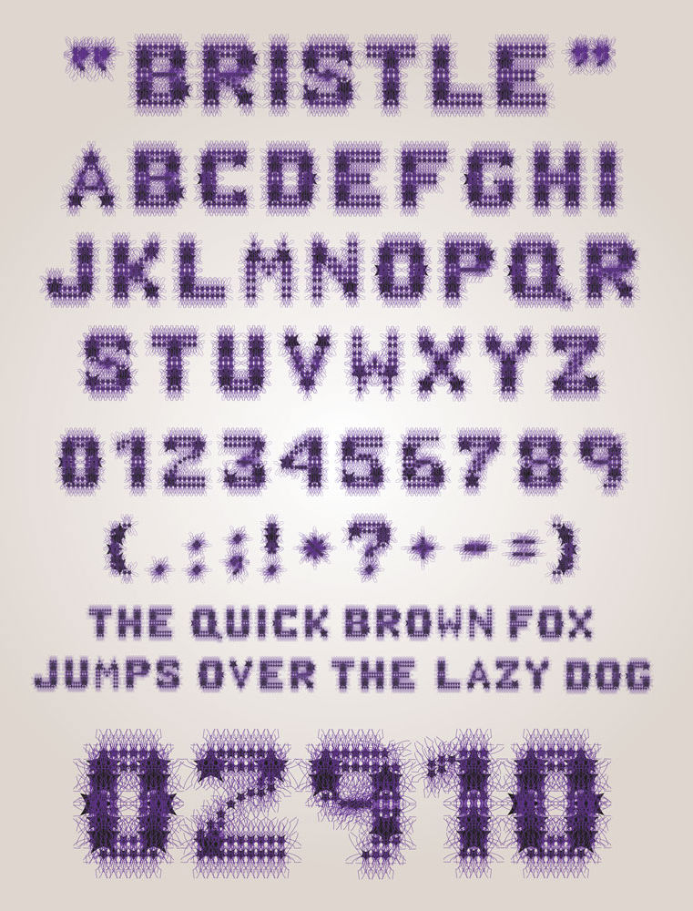 Created in Illustrator, Bristle was built on a matrix of stars in various sizes. The system of stars combine and subtract in various ways to form each letter.