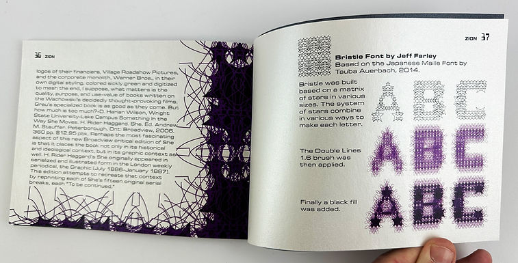 This advanced typography project serves to enhance idea development, graphic design, typography, prototyping, and technical skills through the design of a codex-style book. Formatting a large body of text using Paragraph & Character Styles, Master Pages, Text-Wrap, mixed paper stocks and creative binding are main objectives. My modular font was used as design elements throughout the book. The book was bound by hand using a Japanese stab binding method with a star pattern to tie in with the design of the font.