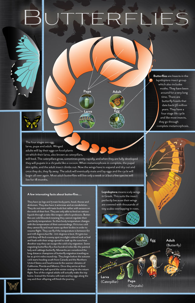 A semester long project based on any insect or animal of my choice. Sketches were hand done created with graphite pencils, colored pencils, and acrylic paint with the final being done digitally. Beginning with a general study, the idea was to examine and study the subject, breaking them down into shapes and using those elements to create many different designs. The final goal was to digitally design a poster sized infographic about the chosen subject.